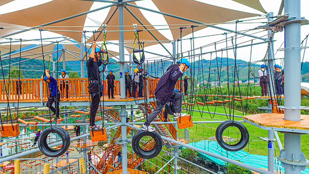 單層高達 4.3m,總高達 19.8m,內(nèi)部以晶體結(jié)構(gòu)搭建架空層 1-4 個步道層級,打造超過 680m 長的空中游樂路線,開模制作,國內(nèi)獨一無二,雙重保護更安全,利用防呆裝置做到安全萬無一失。其中包含 87 個運動項目(包含尖叫滑梯、巨形秋千、低空蹦極),能滿足 150 個游客同時進行冒險體驗,被譽為 " 運動游樂之王 "。