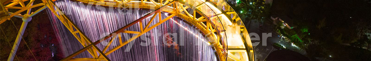 云綜水晶塔總投資 2000 萬元,一層面積 530m2,二層面積 1164m2,三層面積1320m2,總面積約 3000m2,垂直高度約 108m(近 33 層樓高),建在險峻的山體上,共由 21 根巨型鋼柱懸空支撐。獨特的“云”形空中廊橋由平臺向外伸出近 35 米,望去宛如一朵超大的“云”漂浮在高山之上。