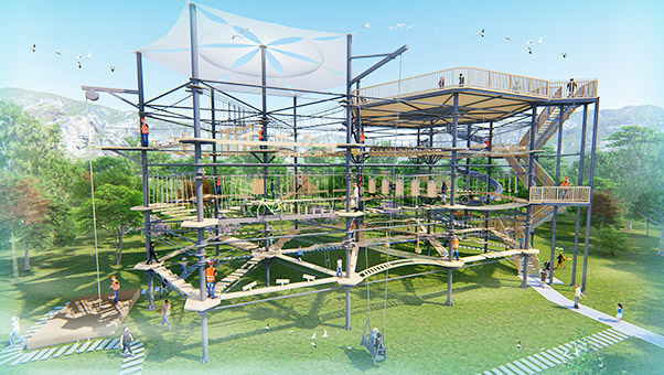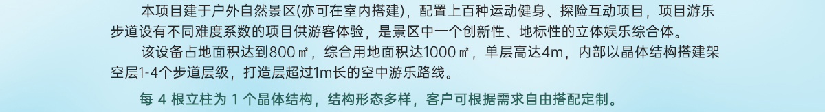本項(xiàng)目建于戶外自然景區(qū)(亦可在室內(nèi)搭建),配置上百種運(yùn)動(dòng)健身、探險(xiǎn)互動(dòng)項(xiàng)目,項(xiàng)目游樂步道設(shè)有不同難度系數(shù)的項(xiàng)目供游客體驗(yàn),是景區(qū)中一個(gè)創(chuàng)新性、地標(biāo)性的立體娛樂綜合體。該設(shè)備占地面積達(dá)到800㎡,綜合用地面積達(dá)1000㎡,單層高達(dá)4m,內(nèi)部以晶體結(jié)構(gòu)搭建架空層1-4個(gè)步道層級,打造層超過1m長的空中游樂路線。