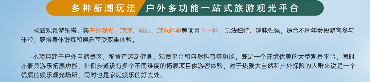 本項目建于戶外自然景區(qū),配置有運動健身、觀景平臺和自然科普等功能。既是一個環(huán)境優(yōu)美的大型觀景平臺,同時亦兼具游樂拓展功能,外側(cè)步道設(shè)有多個不同難度的拓展項目供游客體驗,對于熱愛大自然和戶外探險的人群來說是一個優(yōu)質(zhì)的娛樂觀光場所,同時也是家庭娛樂的好去處。