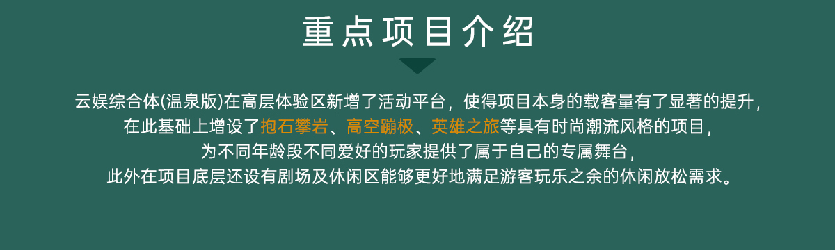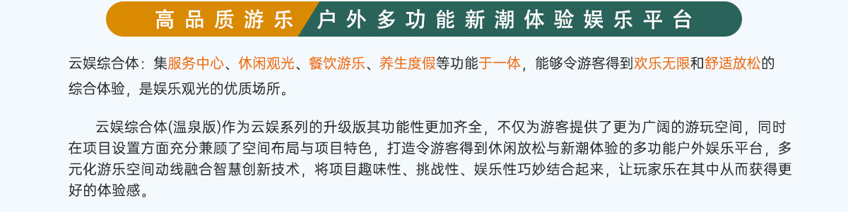 云娛綜合體(溫泉版)作為云娛系列的升級版其功能性更加齊全,不僅為游客提供了更為廣闊的游玩空間,同時在項目設(shè)置方面充分兼顧了空間布局與項目特色,打造令游客得到休閑放松與新潮體驗的多功能戶外娛樂平臺,多元化游樂空間動線融合智慧創(chuàng)新技術(shù),將項目趣味性、挑戰(zhàn)性、娛樂性巧妙結(jié)合起來,讓玩家樂在其中從而獲得更好的體驗感。