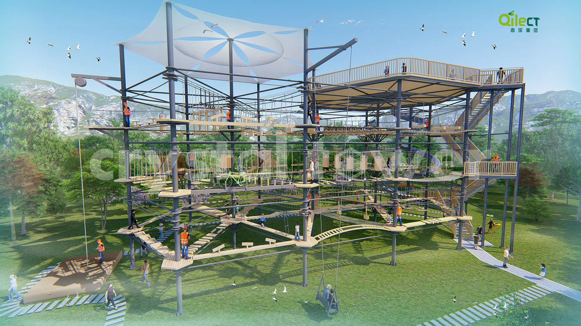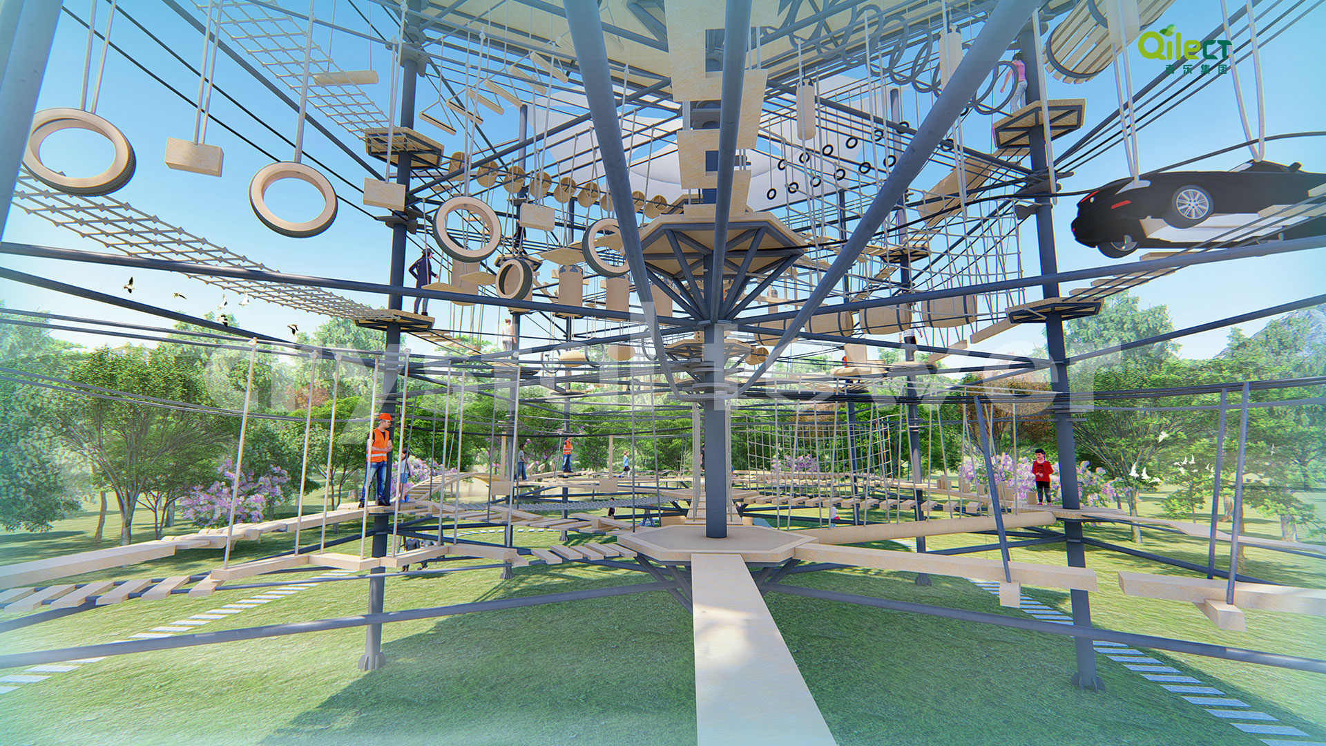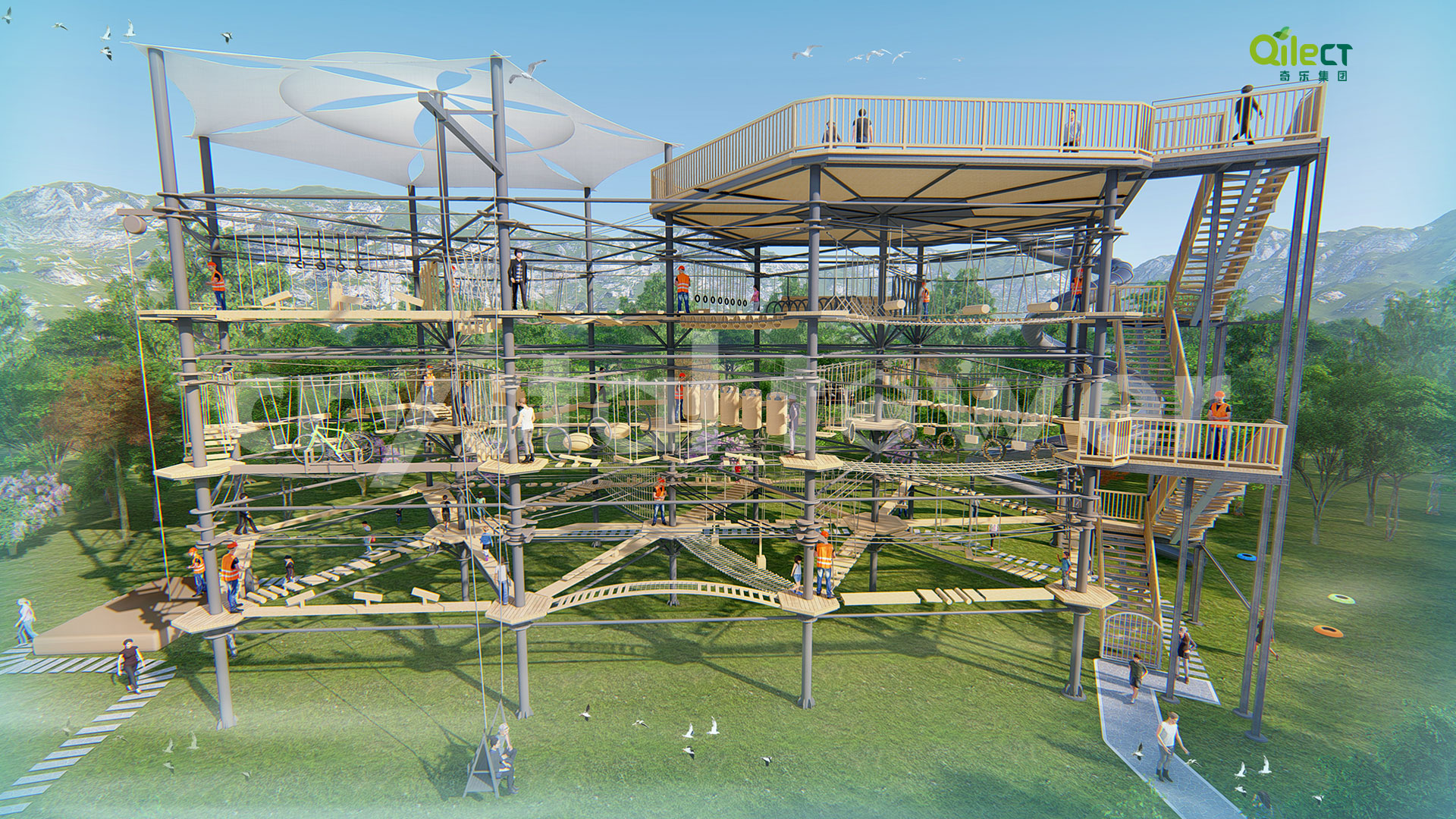 本項(xiàng)目建于戶外自然景區(qū)(亦可在室內(nèi)搭建),配置上百種運(yùn)動(dòng)健身、探險(xiǎn)互動(dòng)項(xiàng)目,項(xiàng)目游樂(lè)步道設(shè)有不同難度系數(shù)的項(xiàng)目供游客體驗(yàn),是景區(qū)中一個(gè)創(chuàng)新性、地標(biāo)性的立體娛樂(lè)綜合體。該設(shè)備占地面積達(dá)到800㎡,綜合用地面積達(dá)1000㎡,單層高達(dá)4m,內(nèi)部以晶體結(jié)構(gòu)搭建架空層1-4個(gè)步道層級(jí),打造層超過(guò)1m長(zhǎng)的空中游樂(lè)路線。